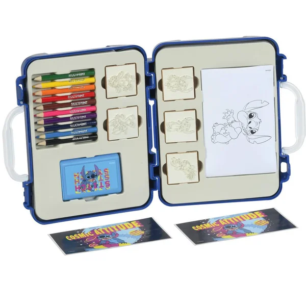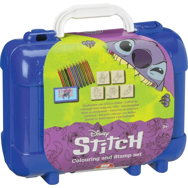 Mallette Travel Set 5 tampons garnie de coloriage Stitch. Contient 5 tampons en bois et latex, 10 crayons de couleur, 2 puzzles autocollants (stickers) pour décorer la mallette, 1 livret d’activités, 1 tampon encreur avec encre lavable et non toxique. Mallette en plastique, que tu peux emporter partout avec toi.