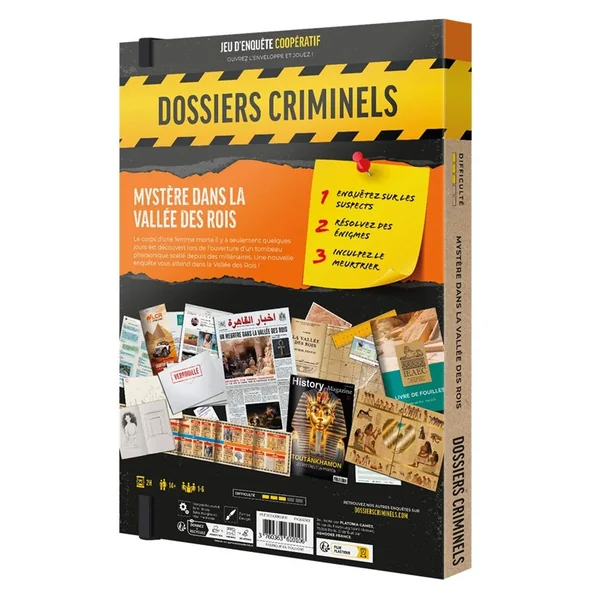 Ce dossier criminel contient tous les éléments pour résoudre ce meurtre. Un guide des fouilles, des transparents de la vallée des rois, des papyrus, un article de presse, des croquis, des contenus audio… etc.