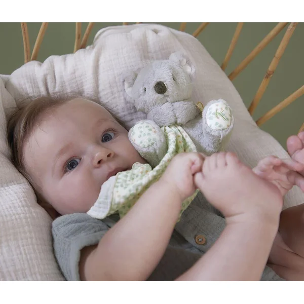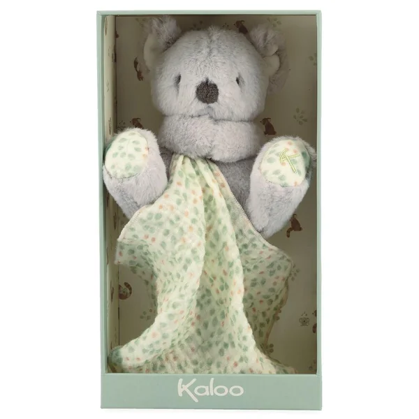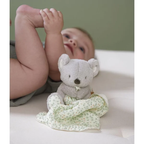 Une petite peluche koala avec son doudou lange accompagne bébé dans son rituel du sommeil. Il sera un repère rassurant pour bébé et transformera le moment du coucher en moment de sérénité. Sa taille de 12 cm le rend facile à agripper et son poil doux en fourrure et ses formes arrondies permettent une meilleure préhension pour bébé. Il est présenté dans une jolie boîte cadeau, personnalisable grâce au petit encart présent sous le couvercle. Le coffret peut être réutilisé comme boîte de rangement ou pour conserver les premiers souvenirs de bébé, dans une boîte assortie à son doudou chéri. Ce doudou contient au moins 80% de matières et rembourrage recyclé. Lavable en machine à 30°C. Dès la naissance.
