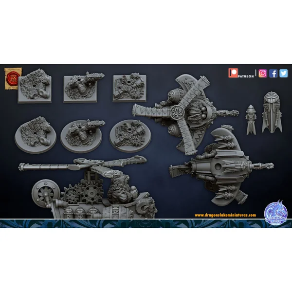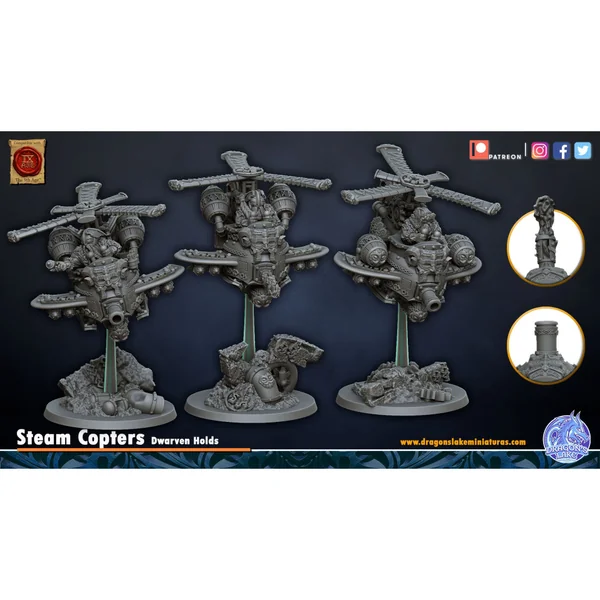 Dans ce pack sont compris les 3 versions du Gyrocoptère que nous avons sur ce modèle, comme visibles sur la photo. Ils sont inclus avec un petit socle scénique ET également leur socle à la bonne taille pour TOW, imprimé en filament (noir non texturé).