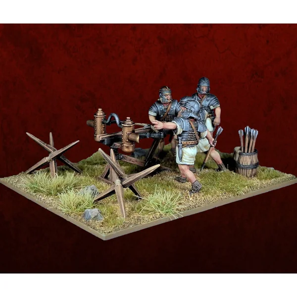 Chaque Centurie romaine au sein d’une Légion était équipée d’une baliste légère (Scorpion ou Manuballista). Ces armes étaient tenues par des légionnaires standards et utilisées sur le terrain ou de manière défensive depuis des forts ou pendant des sièges. Elles étaient capables de lancer une grande flèche ou un projectile à une distance beaucoup plus longue que l’arc classique et ajoutaient une puissance de feu dévastatrice à longue portée et à fort impact à n’importe quelle légion romaine.