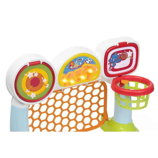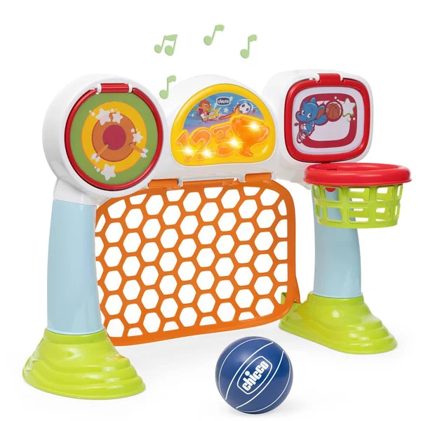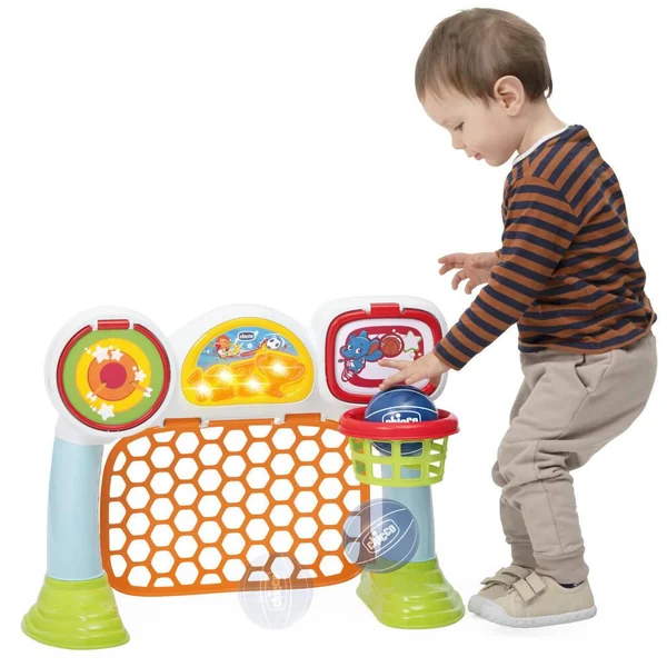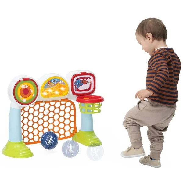 Un classique Chicco transformé en jouet multisport 3 en 1, en plastique recyclé. Il propose 3 jeux pour amuser les tout-petits: but de foot, panier de basket et cible.