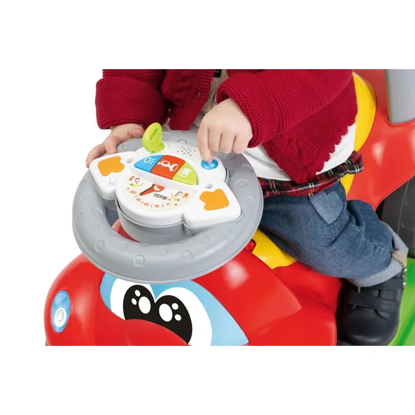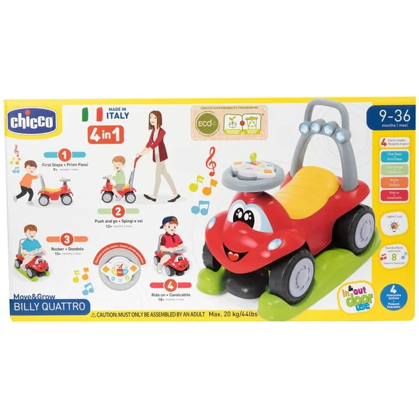 Le Billy Quattro se transforme facilement en culbuto, canne pour pousser, aide à la marche et porteur, répondant ainsi aux différents besoins de développement de votre tout-petit. Son centre d’activités électronique, avec lumières et sons intégrés sur le volant, divertit et stimule les sens de votre enfant, rendant chaque moment de jeu fascinant.