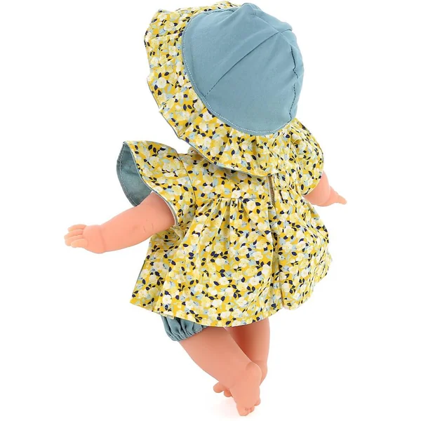 Petit-Câlin 28 cm Ecolo doll avec habillage « Bouton d’Or ». Le corps et les vêtements des bébés Ecolo doll sont fabriqués en Europe avec du coton cultivé sans pesticides. Les bébés Ecolo doll sont livrés dans une boîte en carton recyclé en forme de lit. Tête et membres en vinyle souple parfumé à la vanille, yeux bleus et cheveux blonds avec un corps souple en coton biologique. Poupons lavables en machine à basse température. Le modèle « Bouton d’or » est habillé avec une jolie robe jaune à fleur et un short bleu. 10M+