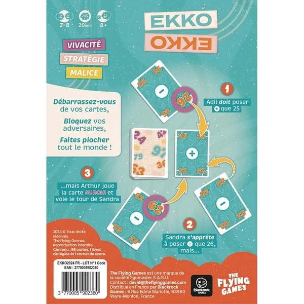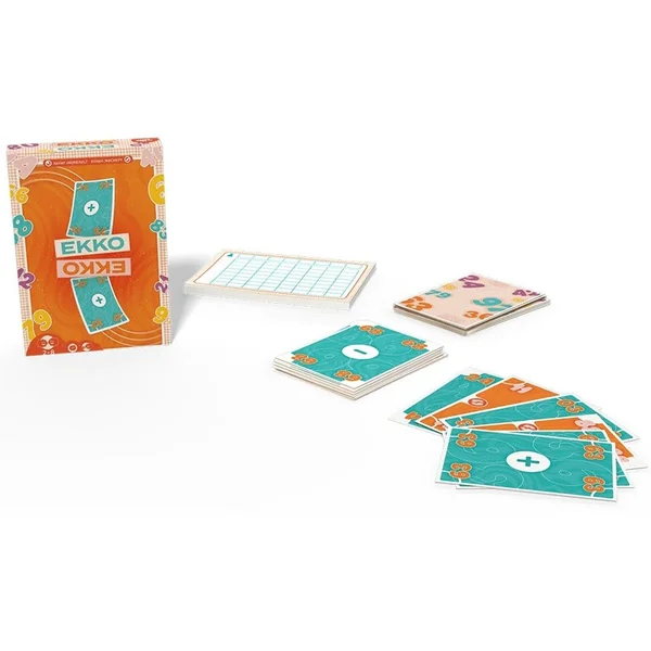 Ekko est un vrai jeu d’ambiance. Durant la partie, tous les joueurs doivent faire attention à ce qu’il se passe autour de la table. En effet, un joueur peut, à tout moment, jouer une carte Miroir et voler ainsi le tour de ses adversaires. La carte Miroir d’une carte est celle dont les chiffres sont inversés par rapport à cette carte. Par exemple, 73 est la carte Miroir de la carte 37. Jouer une carte Miroir permet soit de faire piocher tous les joueurs soit de se débarrasser d’une carte ! Le jeu a aussi un aspect stratégique puisqu’à son tour, on pose une carte en fonction de ce qui est imposé par celle posée par le joueur précédent. Par exemple, si je pose mon 02 (sur lequel est indiqué le signe -), le joueur suivant devra obligatoirement jouer moins que 02, ce qui est très improbable puisque les cartes vont de 01 à 98, l’obligeant là encore à piocher une carte.