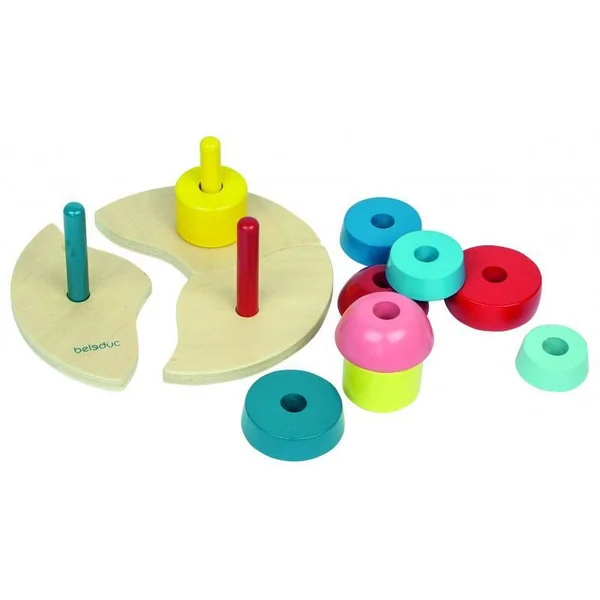 Contenu du jeu : 3 plaques de base avec picots, 2 jaune, 3 rouges et 4 formes d’empilement bleues. Matière : Bois FAQ
