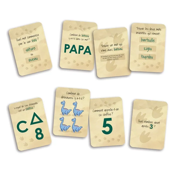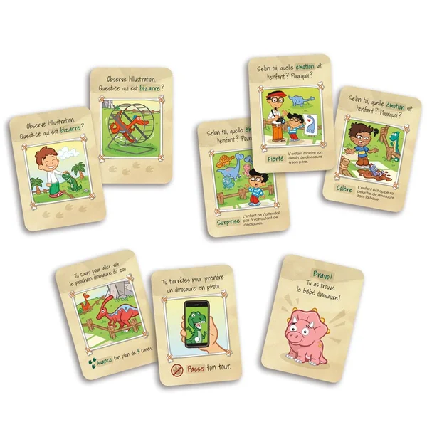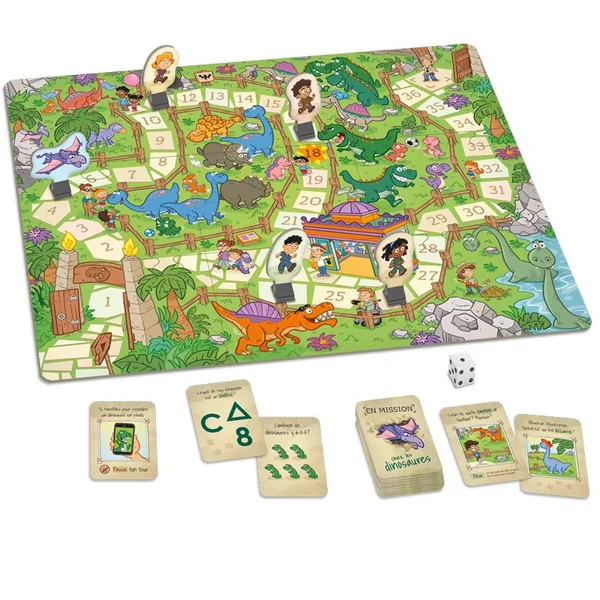 En mission chez les dinosaures a été conçu pour soutenir le développement global de l’enfant de 4 ans à 5½ ans. Dans ce jeu de parcours, l’enfant cherche notamment à reconnaitre des émotions et leurs causes, à décrire à l’oral des situations bizarres vécues par des dinosaures, à reconnaitre les nombres de 0 à 10 et quelques lettres de l’alphabet, ainsi qu’à prendre conscience des sons qui composent les mots.