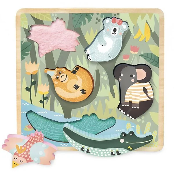 Un encastrement poétique sur le thème de la jungle dessiné par Michelle Carlslund. Les textures animalières sont à découvrir quand on soulève les pièces. Les animaux feront également de très bons compagnons de jeux.