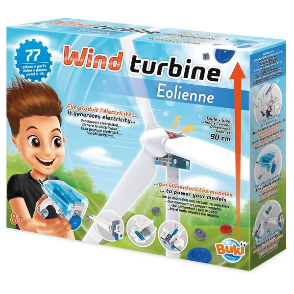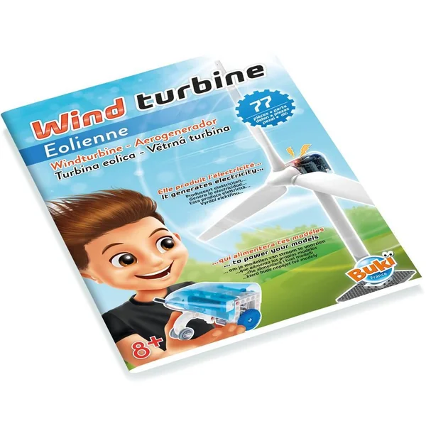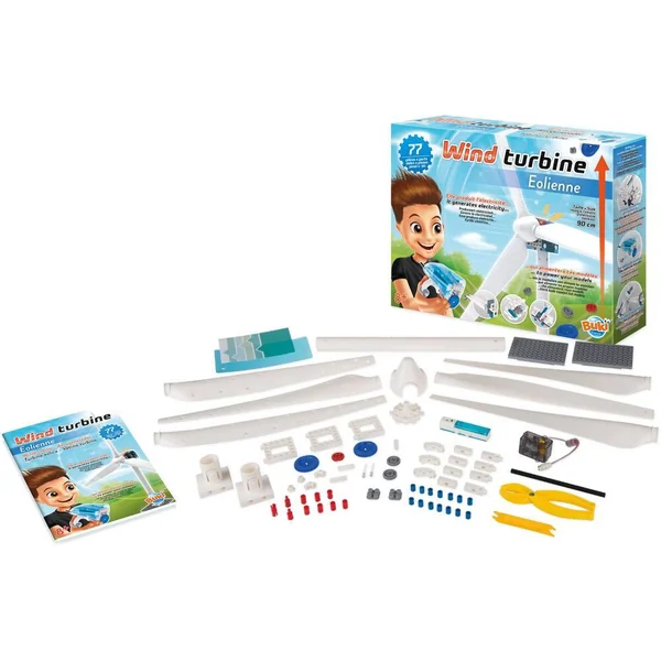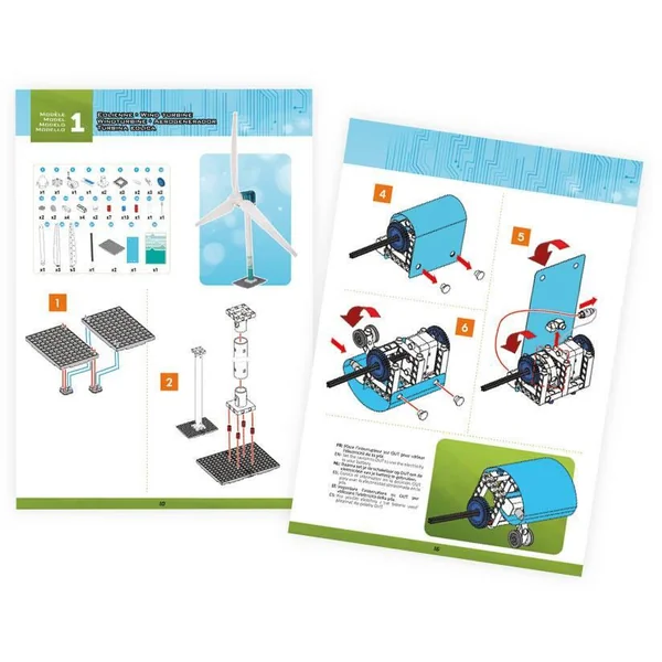 Une éolienne géante de 90 cm à assembler et à fixer dans le jardin Le vent fait tourner les pales et le générateur va produire de l’électricité pour recharger une pile La pile peut alimenter le moteur d’un voiture à assembler. Notice illustrée en couleurs avec schéma de montage détaillés.