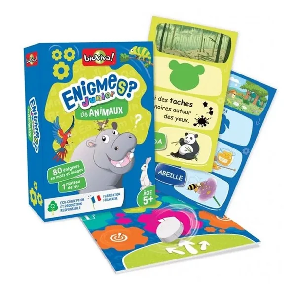 Avec Énigmes Junior – Les animaux, les enfants tentent de deviner quel animal se cache derrière la carte à travers 3 indices en mots et en images.