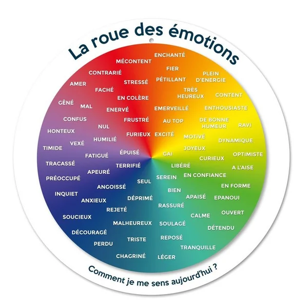 - Outil visuel : roue divisée en deux parties avec les émotions agréables(joie, sérénité) et les émotions désagréables (tristesse, peur, colère). Codes couleurs intuitifs.