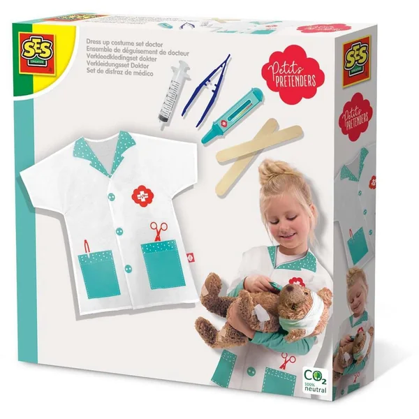 Deviens un vrai docteur avec cet ensemble de déguisement ! Oh là là, ton ours en peluche préféré ne se sent pas très bien. Vas-tu prendre sa température ? Il faut aussi ausculter les autres patients. Cet ensemble de déguisement contient une blouse de docteur, un thermomètre de jeu, deux abaisse-langues, une pince et une seringue. Tu peux même combiner cet ensemble avec les autres accessoires de docteur de la collection Petits pretenders .