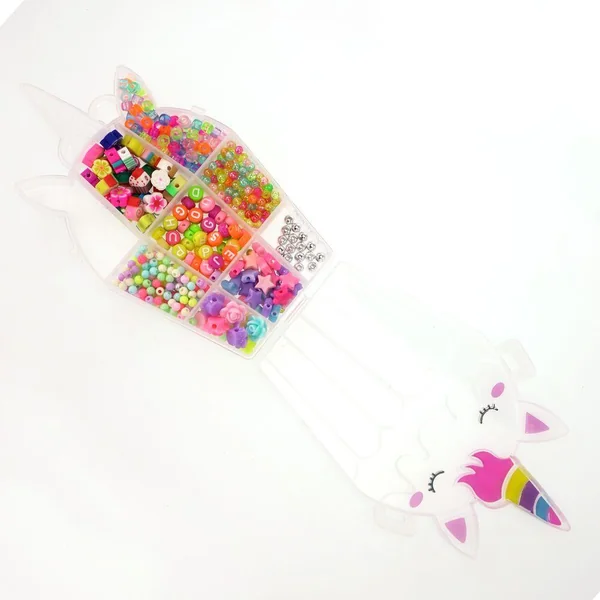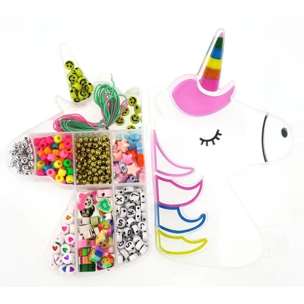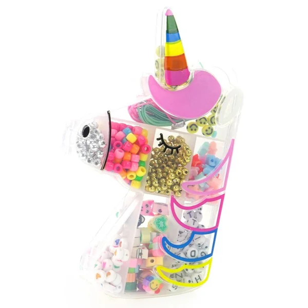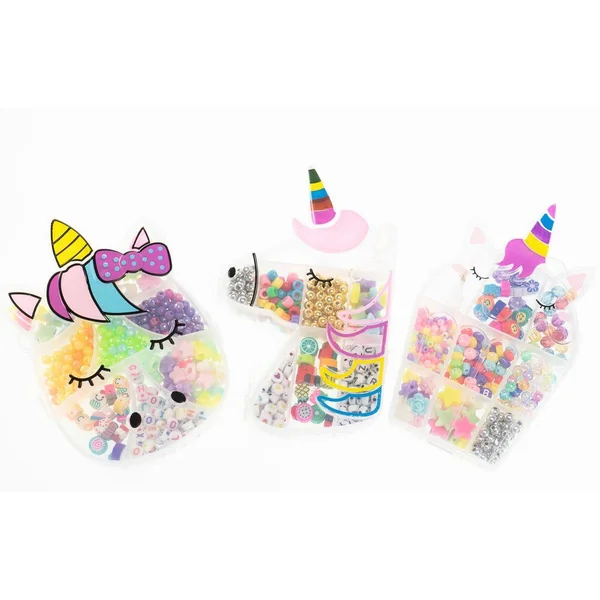 Ensemble en forme de licorne à emporter avec vous (en trois versions différentes) avec des perles colorées en forme d’étoiles, des perles dorées et argentées, des clindretti, des fleurs, des cœurs, des lettres et diverses formes en fymo.