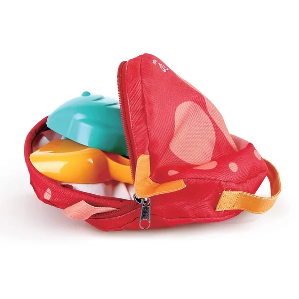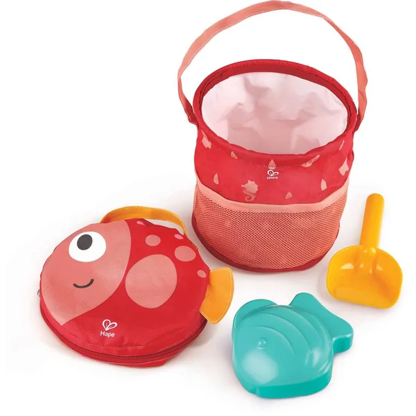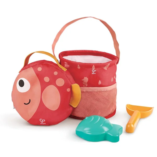 L’ensemble complet comprend un seau pliant, une pelle, un moule de sable en forme de poisson et un sac de toile pour ranger l’ensemble.