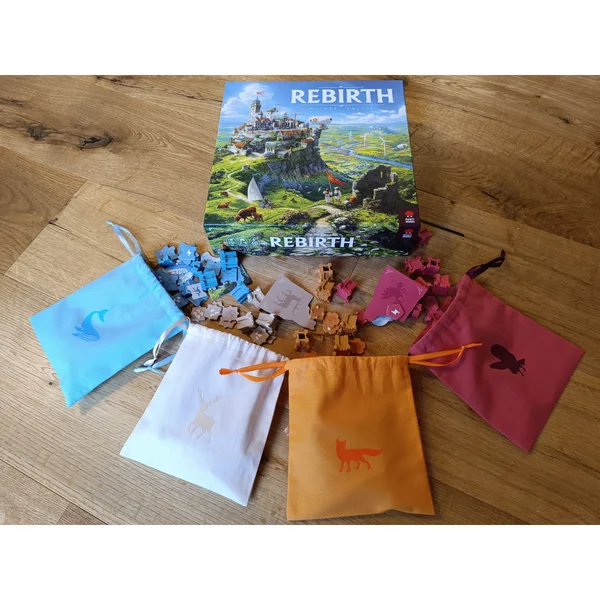 Lot de quatre sacs aux couleurs vives, chacun orné d’un logo animal assorti, compatible avec le jeu de société Rebirth. Assez grands pour ranger tous les composants de chaque joueur et piocher des tuiles pendant la partie. Fini les mélanges et les empilages secrets. Installation rapide, rangement pratique et superbe présentation visuelle, tout-en-un !