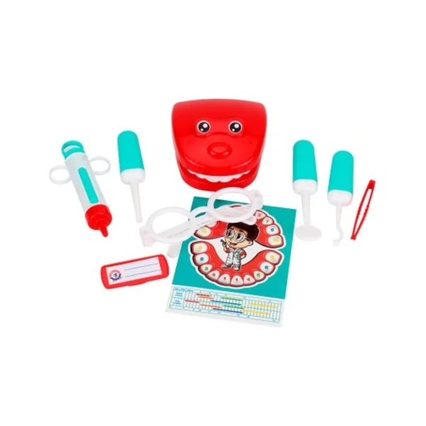 Avec des lunettes et un badge, l’enfant se sentira comme un véritable dentiste. Le modèle de mâchoire aidera à examiner plus en détail les dents et selon le schéma de « numérotation des dents », l’enfant peut apprendre avec sa maman dans quel ordre les dents poussent.