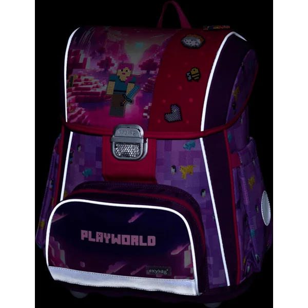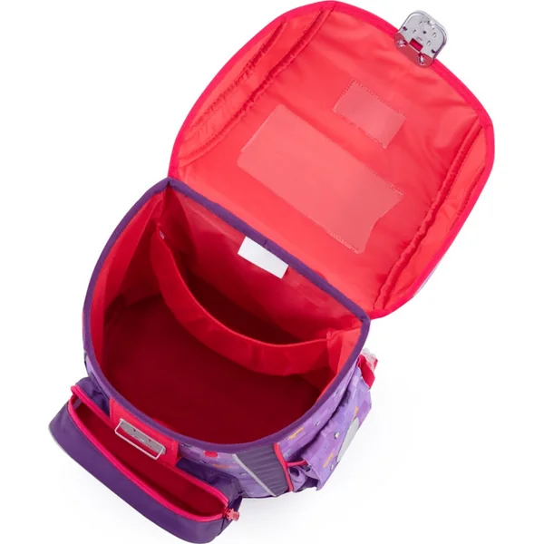 Le cartable se compose d’un compartiment spacieux, où tous les fournitures scolaires pour les enfants de 1ère et 2ème classe peuvent être facilement rangées. Le fond du sac à dos est en matériau solide, protégeant ainsi le contenu contre les renversements et les déversements. La fermeture est dotée d’une boucle en métal de sécurité avec un réflecteur. La poche avant est destinée au goûter, et plusieurs éléments réfléchissants sont présents, rendant le cartable plus visible.