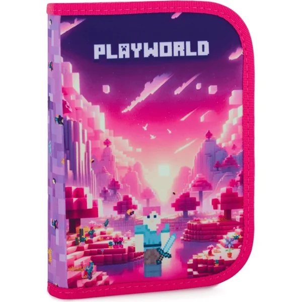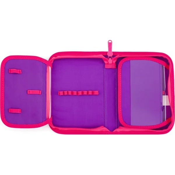 Trousse scolaire à un étage avec deux rabats sans fournitures. Élastiques pour maintenir les instruments d’écriture. Sur le rabat intérieur, il y a une feuille transparente pour l’emploi du temps.