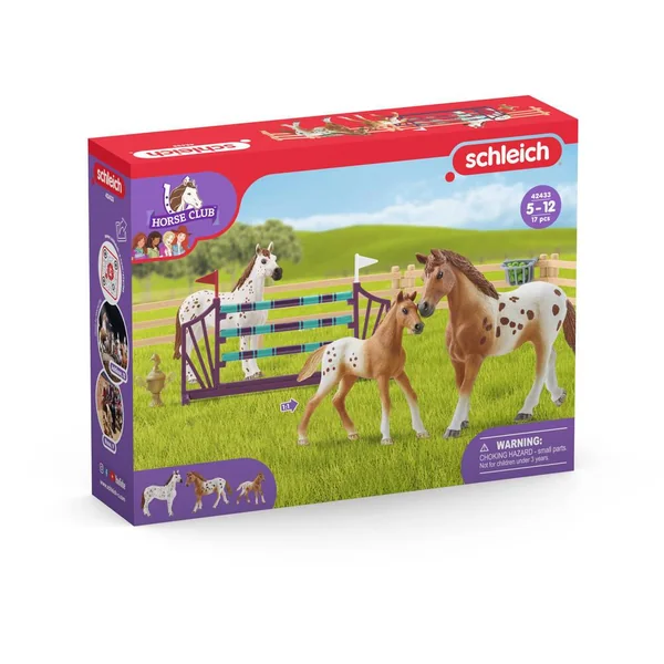 Lisa s’occupe de l’entraînement des Appaloosas pour le concours à venir. Un jour, alors que Lisa se rendait à l’enclos des Appaloosas, elle a vu la jument en train de sauter des obstacles, alors que les Kramers avaient prévu qu’elle s’fasse de l’équitation Western. Depuis, elles s’entraînent secrètement toutes les deux. Curieux, le petit poulain tacheté ainsi que le hongre Appaloosa observent la scène depuis leur enclos. Les figurines Schleich sont toutes modélisées en détail et soigneusement peintes à la main ; elles assurent des jeux à forte valeur pédagogique.