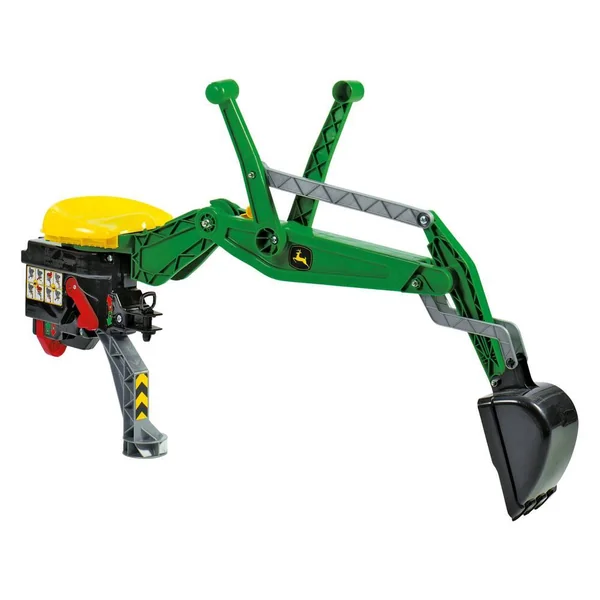 Excavateur arrière RollyHeckbagger John Deere, pour enfants à partir de 2 ans et demi. Capacité de charge jusqu’à 50 kg, capable de fonctionner sur tous les tracteurs Rolly Toys exceptés pour le RollyMinitrac. Version à siège avec pied de support rabattable, fonction de sécurité brevetées avec verrouillage automatique du bras de chargement. Mouvement du bras pivotant conforme à l’original. De couleur vert.