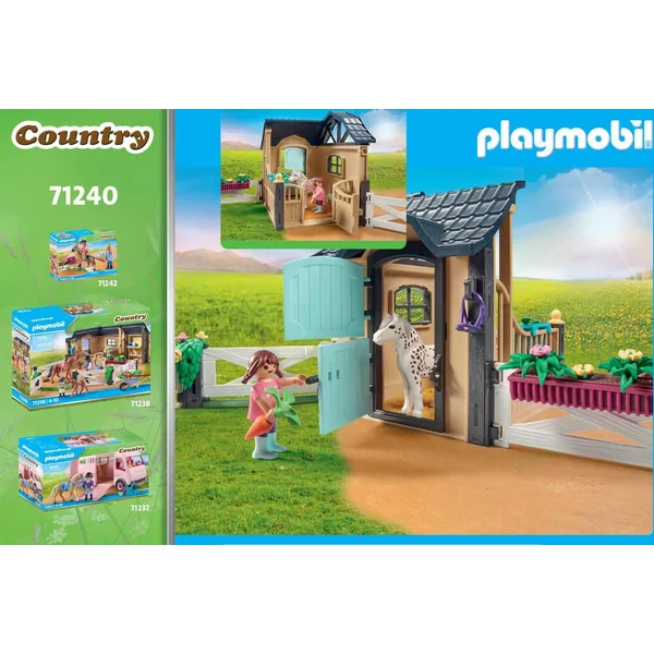 Contient un personnage, un cheval et des accessoires pour le box à cheval. 68 pièces.