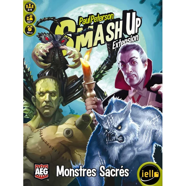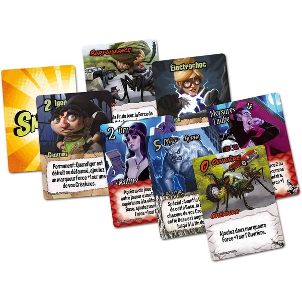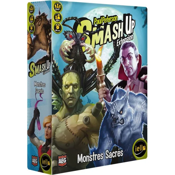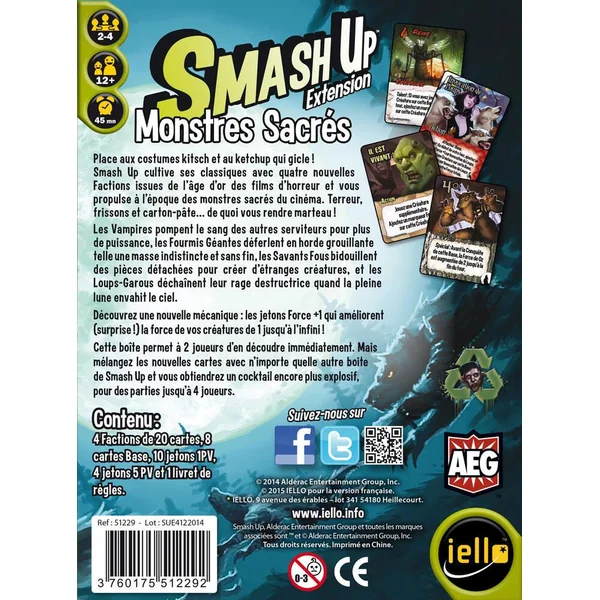 Place aux costumes kitsch et au ketchup qui gicle ! Smash Up cultive ses classiques avec quatre nouvelles Factions issues de l’âge d’or des films d’horreur et vous propulse à l’époque des monstres sacrés du cinéma. Terreur, frissons et carton-pâte… de quoi vous rendre marteau ! Les Vampires pompent le sang des autres serviteurs pour plus de puissance, les Fourmis Géantes déferlent en horde grouillante telle une masse indistincte et sans fin, les Savants Fous bidouillent des pièces détachées pour créer d’étranges créatures, et les Loups-Garous déchaînent leur rage destructrice quand la pleine lune envahit le ciel. Découvrez une nouvelle mécanique : les jetons Force +1 qui améliorent (surprise !) la force de vos créatures de 1 jusqu’à l’infini ! Cette boîte permet à 2 joueurs d’en découdre immédiatement. Mais mélangez les nouvelles cartes avec n’importe quelle autre boite de Smash Up et vous obtiendrez un cocktail encore plus explosif, pour des parties jusqu’à 4 joueurs. Temps de la partie : 45 minutes. De 2 à 4 joueurs.