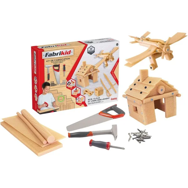 Avec ce kit complet de construction tu vas pouvoir te familiariser avec les outils et la matière. Scie, cloue et visse tel un véritable bricoleur ! Tu pourras fabriquer facilement au moins 2 projets. Contient : 1 marteau, 1 petite scie, 1 tournevis, des vis, des clous, du bois Fabrikid (3 planches taille 14.5 x 40 x 1.9 cm et 3 planches 14.5 x 40 x 0.6 cm, 6 rondins de deux tailles) et un livret d’instructions très détaillé pour réaliser les objets indiqués.