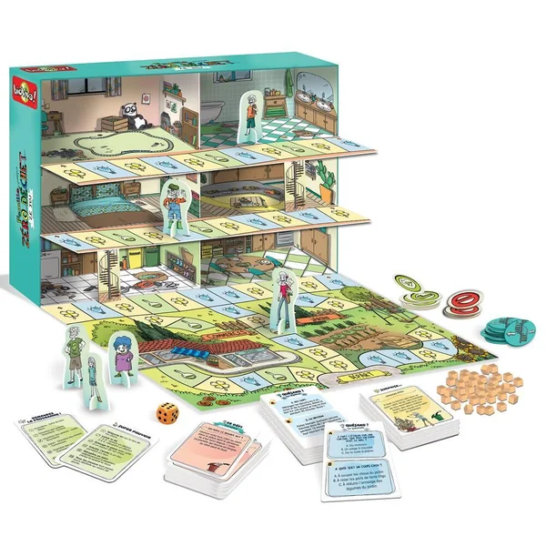 Explore la maison et tente de réduire au maximum la quantité de déchets. Perspicacité, rapidité, humour et stratégie seront tes alliés pour remporter la partie et devenir presque zéro déchet ! De 2 à 6 joueurs. Dès 8 ans. Fabriqué en France. Contient : 1 maison 3D, 1 plateau de jeu, 6 pions personnage, 30 cubes en bois « Déchet », 128 cartes, 10 jetons « Déplacement escalier », 3 jetons « Demandez le programme ! », 4 jetons « Lieu interdit », 1 dé en bois et 1 règle du jeu. Durée du jeu : 30 minutes. Jeu éducatif éco-conçu, fabriqué exclusivement en France. Labellisé Origine France Garantie.