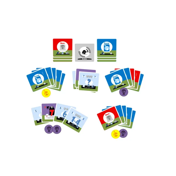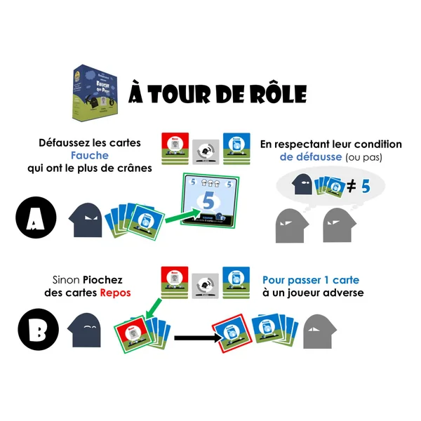 A tour de rôle, vous pouvez vous débarrasser de vos cartes soit en les jouant au centre (action de Fauche), soit en les passant aux joueurs adverses (action de Repos).