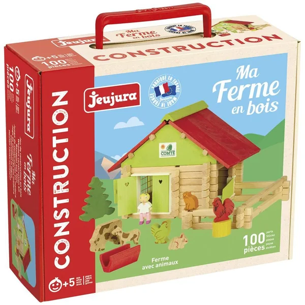 Ferme avec Animaux – 100 pièces : jeu de construction en bois naturel et teinté avec une notice de montage, valisette carton : 26 x 24 x 9 cm –