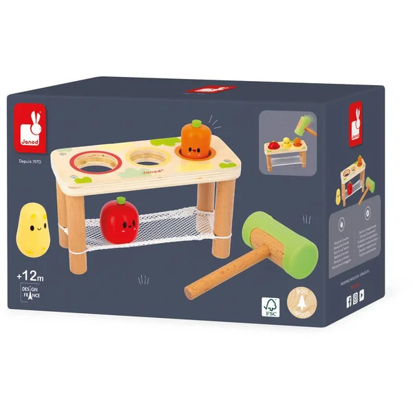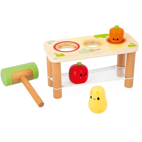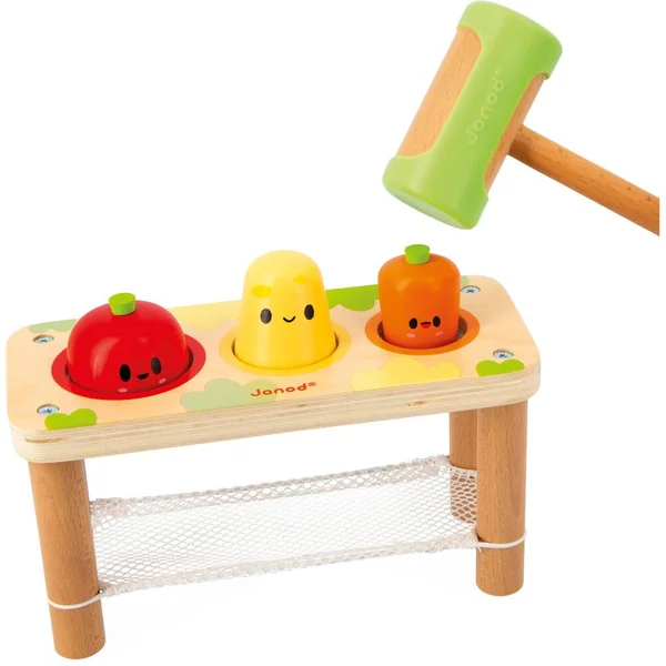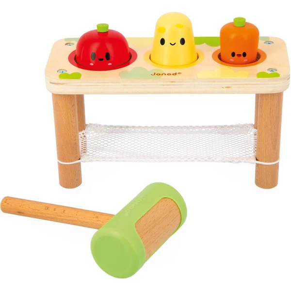 Le jouet se compose d’un support avec un filet, une tomate, une pomme de terre, une carotte et un marteau en bois. Le but du jeu est de placer chaque légume dans son emplacement, puis de le faire tomber dans le filet en le frappant avec le marteau. Grâce à sa coque en silicone, le marteau limite le bruit pendant le jeu, pratique ! Ce jouet permettra à votre enfant de se familiariser avec les légumes et de développer sa dextérité tout en s’amusant. Idéal pour des moments de rires et d’apprentissages !