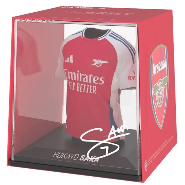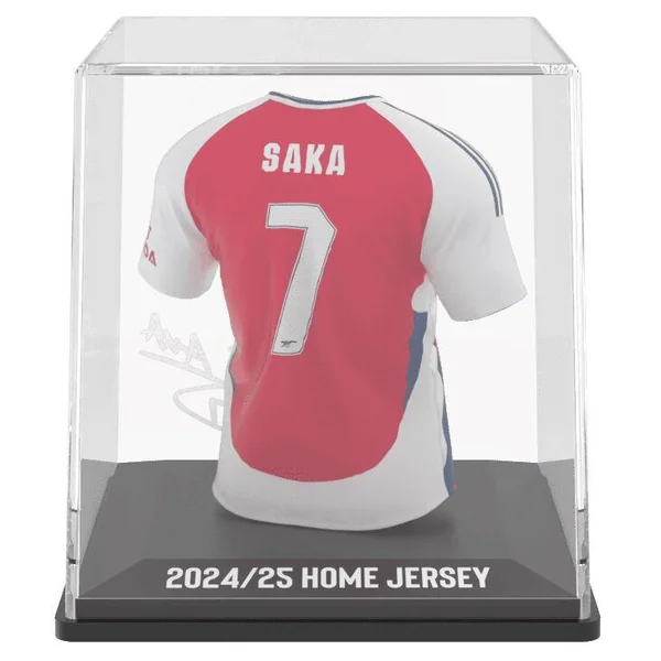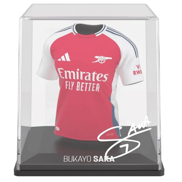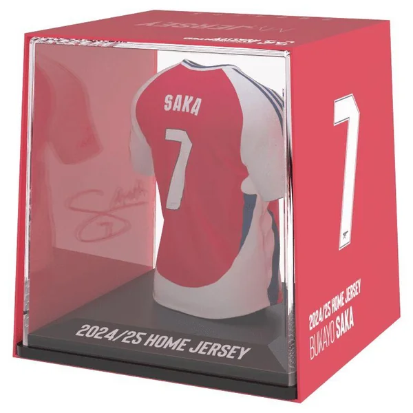 Figurine du maillot du footballeur Bukayo Saka : maillot domicile de l’équipe d’Arsenal FC 2024/2025. Hauteur : 9.5 cm.