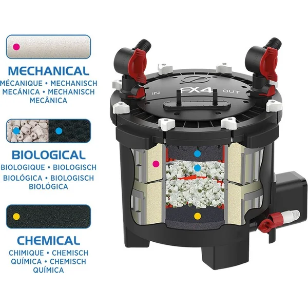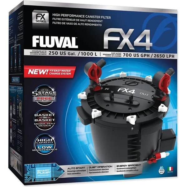 Le nouveau filtre extérieur Fluval FX4 a une puissance de pompe de 2650 litres d’eau par heure et possède une capacité de filtration impressionnante qui produit l’eau la plus propre et la plus saine qui soit.