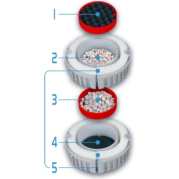 Les paniers peuvent contenir au total 3,9 l de médias et peuvent être « empilés » dans une combinaison précise de couches, pour obtenir la meilleure eau dans l’aquarium. Chacun d’eux est revêtu d’un insert en mousse pour un pré-filtrage mécanique efficace lors de la filtration. L’ouverture facile à l’aide d’une poignée permet de soulever et de séparer les paniers rapidement et simplement, rendant ainsi l’entretien courant plus facile.
