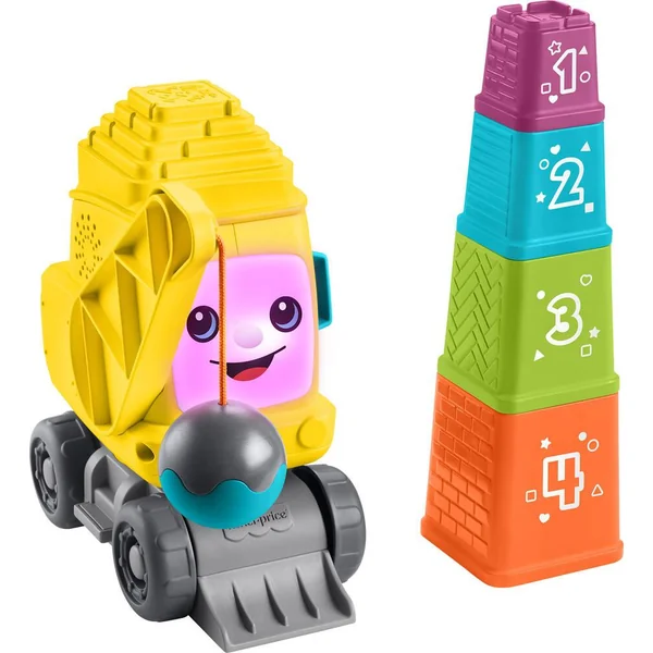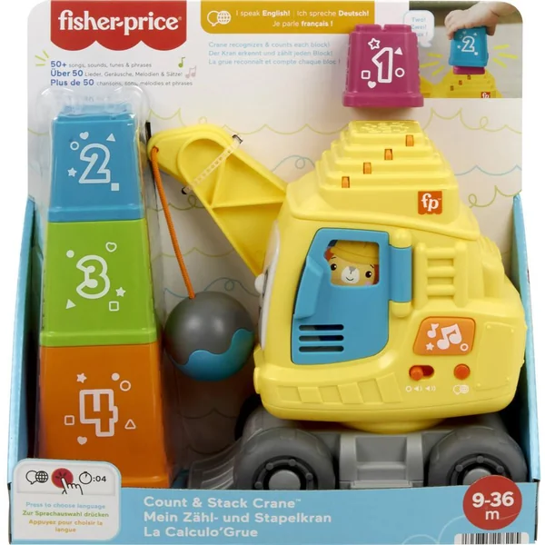 Empilez les blocs sur la grue pour l’illuminer et l’entendre dire les chiffres. Ouvrez la porte pour déclencher des chansons et des sons amusants. Véhicule de construction à pousser avec plus de 50 sons et phrases pour découvrir les chiffres, les couleurs et les formes. La grue reconnaît les blocs lorsqu’ils sont empilés ou emboîtés et réagit par des lumières, des sons et des phrases. Appuyez sur le bouton en forme de globe pour choisir la langue : anglais, allemand, français – Appuyez sur le bouton musique, et ouvrez et fermez la porte pour activer d’autres lumières et sons – La boule de démolition émet des sons amusants de cliquetis pour stimuler encore plus les sens – Renforce la motricité fine et globale des enfants de 9 mois à 3 ans.