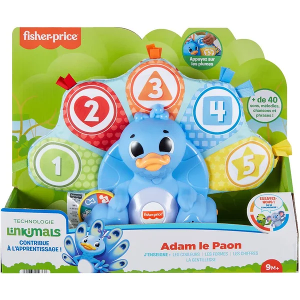 Offrez un ami à plumes à bébé avec ce jouet Linkimals Adam le Paon de Fisher-Price, qui l’aidera dans son apprentissage des chiffres, des couleurs, des formes et de la politesse grâce à des activités interactives. Bébé peut presser les 5 plumes colorées de la queue du paon ou tourner la roue pour activer des chansons, des sons, des phrases et des lumières multicolores. Et lorsque cet adorable paon rencontre d’autres amis Linkimals, ils peuvent s’illuminer, parler, chanter et jouer en chœur !