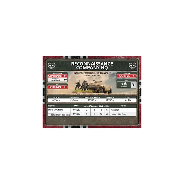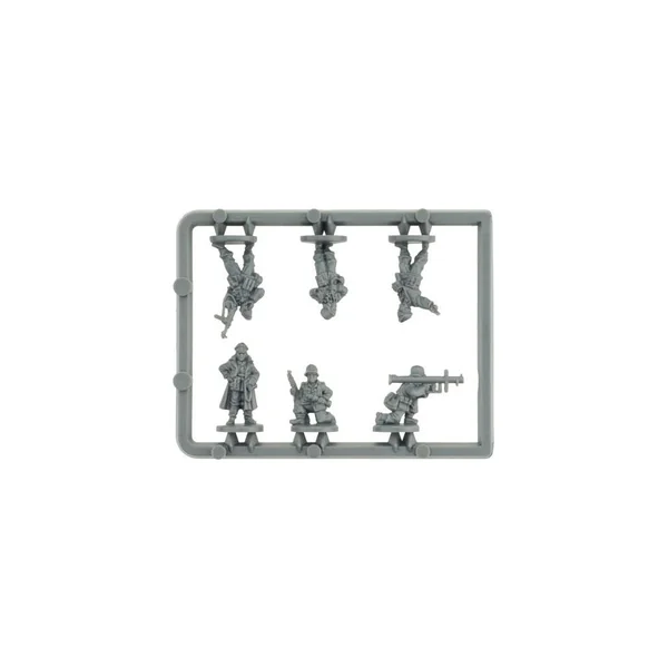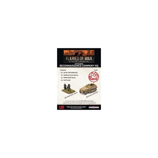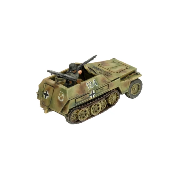 Cette boîte contient 2 SdKfz 250 half-tracks, 2 grappes d’équipage en plastique et 2 unités équipées de MP40 en plastique et 3 cartes d’unité. À assembler et à peindre.