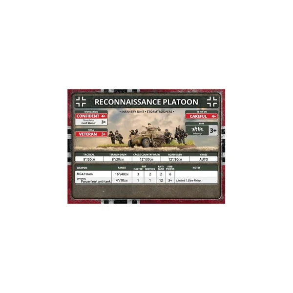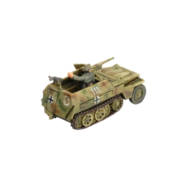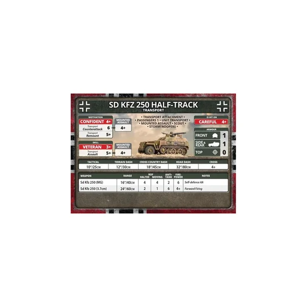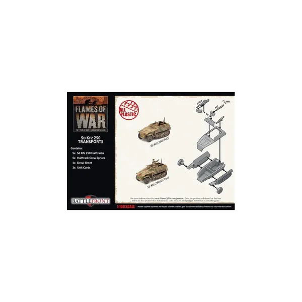 Cette boîte contient 5 Half-tracks SdKfz 250, 5 grappes de membres d’équipage en plastique, une feuille de décalcomanies et 3 cartes d’unités. À assembler et à peindre.