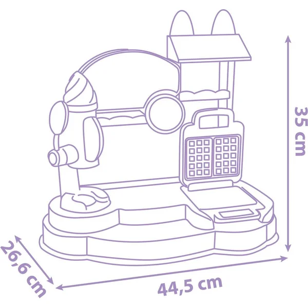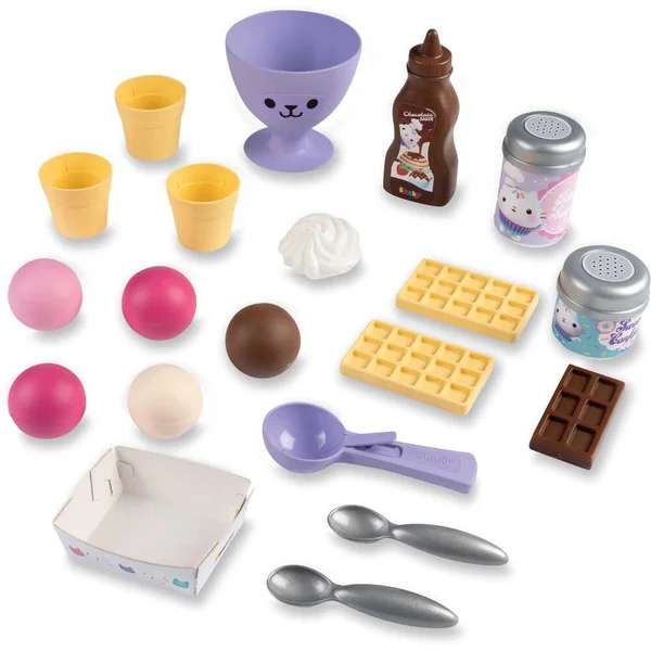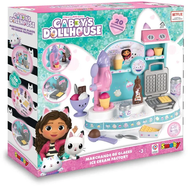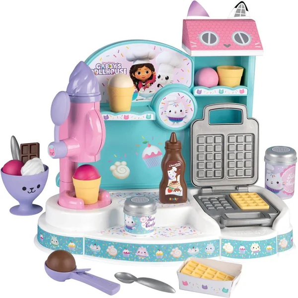 Marchande de glaces Gabby est composée de : 1 machine à glaces, 1 gaufrier et de nombreux accessoires et espaces rangements. 20 accessoires inclus : – 5 boules de glace – 2 cuillères – 3 cornets de glace – 2 gaufres