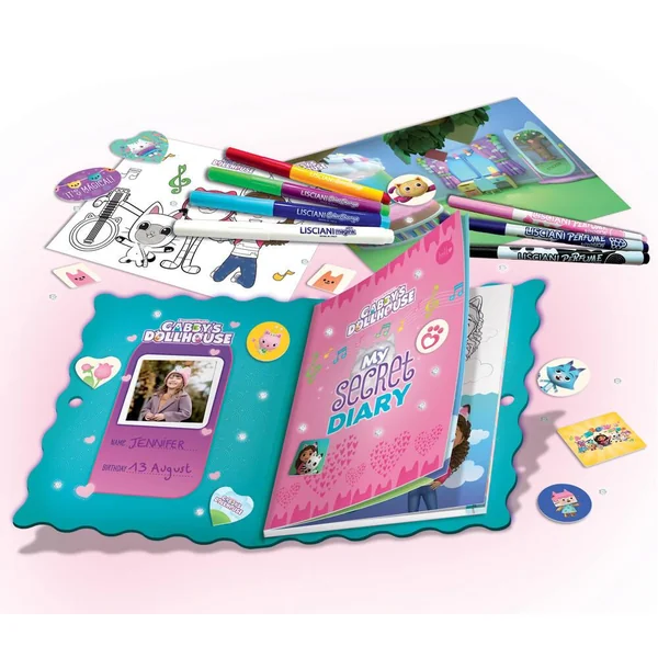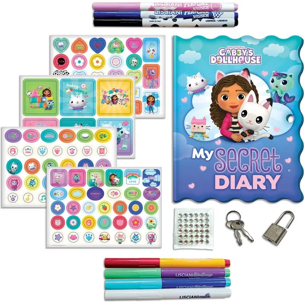 Le Journal Secret de GABBY’S DOLLHOUSE est l’endroit idéal pour garder tous tes secrets et tes créations, et grâce à ce kit, tu peux le créer et le personnaliser comme tu le souhaites ! À l’intérieur du pack, tu trouveras différents types de stylos : des stylos fluorescents pour illuminer tes dessins, des stylos parfumés pour laisser un délicat parfum sur la page et des stylos magiques pour changer la couleur de tes créations quand tu le souhaites. Tu peux rendre ton journal encore plus spécial grâce aux fantastiques autocollants et gemmes inclus dans l’emballage et tu peux garder tes secrets en sécurité grâce au cadenas pratique !
