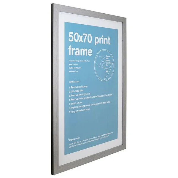 Dans un salon, un couloir, une chambre ou même un escalier, le cadre est l’idée de décoration parfaite pour personnaliser son intérieur. Quelques photos de familles, illustrations ou posters glissés dans de beaux cadres suffisent pour sublimer votre espace.>Cadre argent 50 x 70>Adapté pour poster ou affiche 50 x 70>Possibilité d’accrocher aussi bien verticalement qu’horizontalement>Vitre en plexiglas incassable pour plus de sécurité>Un film spécial est apposé sur le plexiglas de chaque côté pour une meilleure protection pendant le transport. Facile à retirer avant utilisation>Cadre protégé par quatre coins en plastique pour le transportCaractéristiques : >Matière : MDF>Disponibilité couleur : Noir, Chêne, Blanc, Argent>Largeur de la moulure : 30 mm>Profondeur de la moulure : 15 mm>Fabriqué en Angleterre