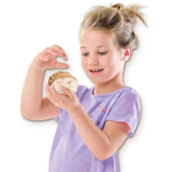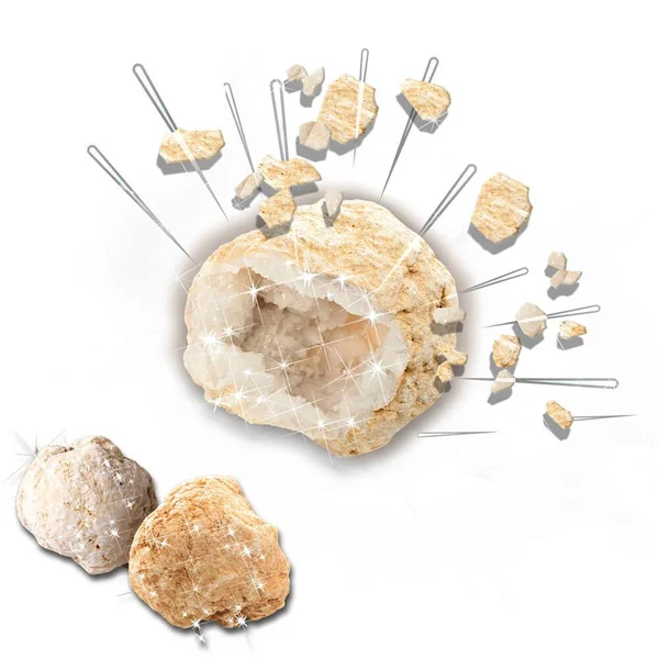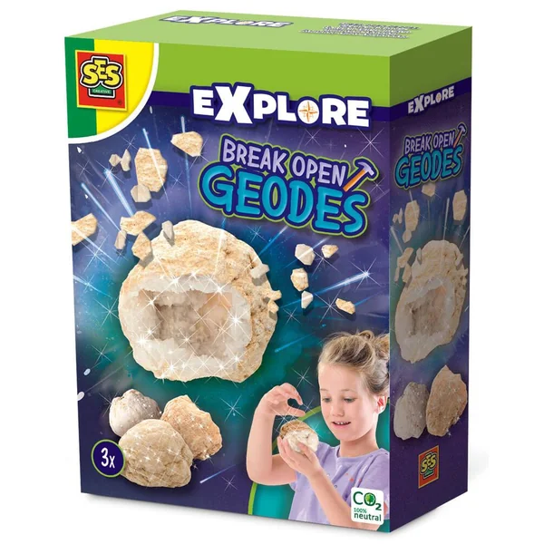 Découvre de véritables géodes ! As-tu déjà vu une vraie géode ? Avec ce kit, découvre et ouvre toi-même des géodes. Mets les géodes dans un sac et brise-les avec un marteau. À présent, tu peux regarder ce que cachait la pierre. Ces véritables cristaux vont certainement te plaire… Le kit contient trois pierres à géodes, un sac et des instructions. Le marteau n’est pas inclus.