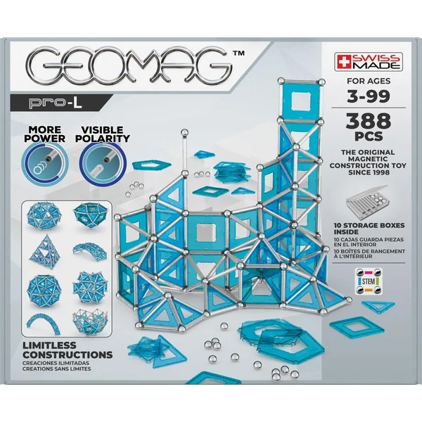 Geomag est un dispositif de construction astucieux, mais facile à utiliser, qui se compose de tiges magnétiques et de billes d’acier. Il vous permet de réaliser une multitude de formes et structures en 3D sans limite. Ce jouet extrêmement ludique favorise la compréhension de l’espace, stimule les compétences en construction et encourage à la fois la créativité et le raisonnement logique. L’aimantation maximale des aimants assure que les structures les plus complexes sont réalisables et avec l’utilisation de panneaux, une stabilité supplémentaire peut être apportée.
