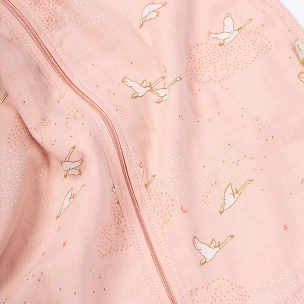 Gigoteuse d’été 0-6 mois, zippée sur le devant. En lange rose imprimé cygnes, 100% coton bio, elle est légère et respirante. Matière idéale pour les températures estivales (TOG 1), le lange gaufre et s’adoucit à chaque lavage. Tissu certifié OEKO-TEX®
