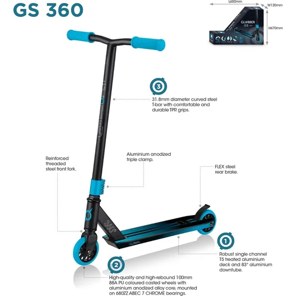 Vivez vos premières balades, sauts et tricks avec la trottinette Globber GS 360 Stunt, qui possède toutes les fonctionnalités essentielles dont les jeunes athlètes ont besoin pour apprendre les bases de ce sport émergent.