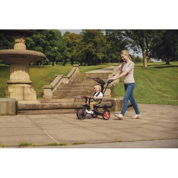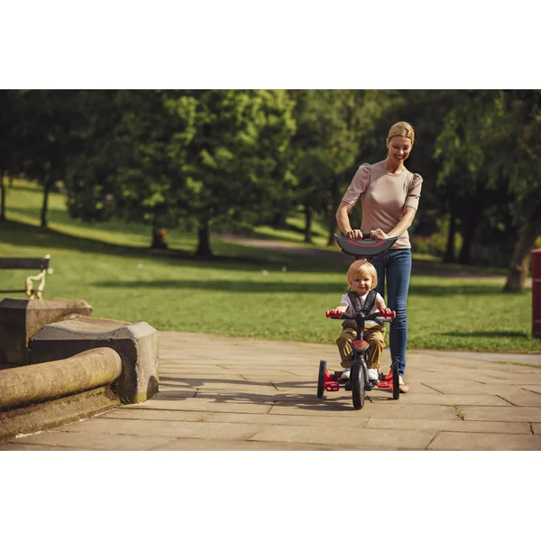 En mode tricycle confortable à partir de 10 mois, ce tricycle évolutif est équipé de tout ce qui garantit sécurité et confort : siège haut réglable en 2 hauteurs, appuie-tête, freins arrière (sur chaque roue), ceinture de sécurité à 5 points, barre de sécurité et pare-soleil amovible -UV pliable. La barre de direction est réglable en 2 hauteurs.