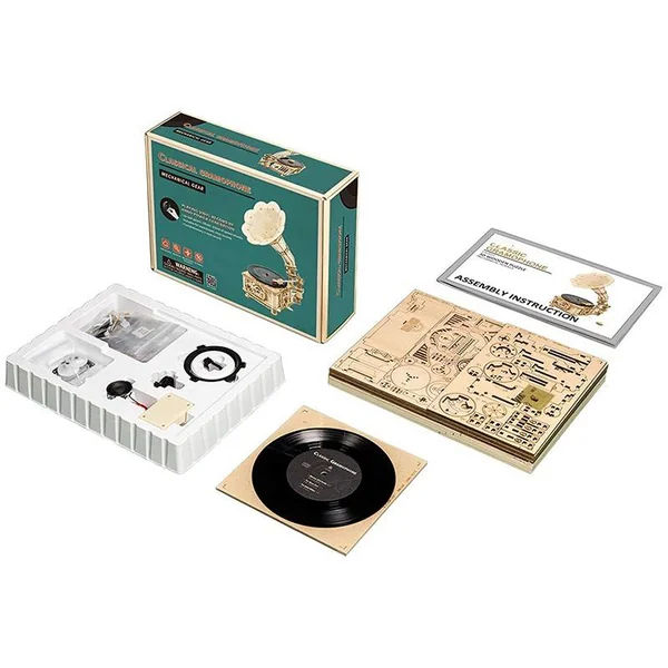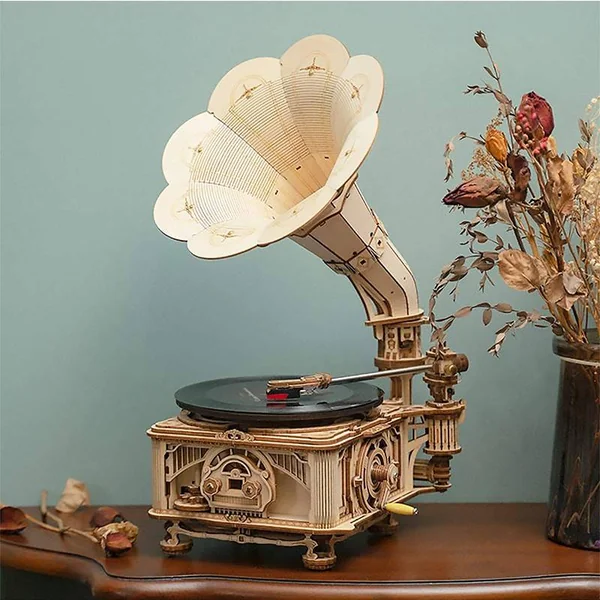 Gramophone à manivelle – Puzzle 3D Mécanique en bois Rokr