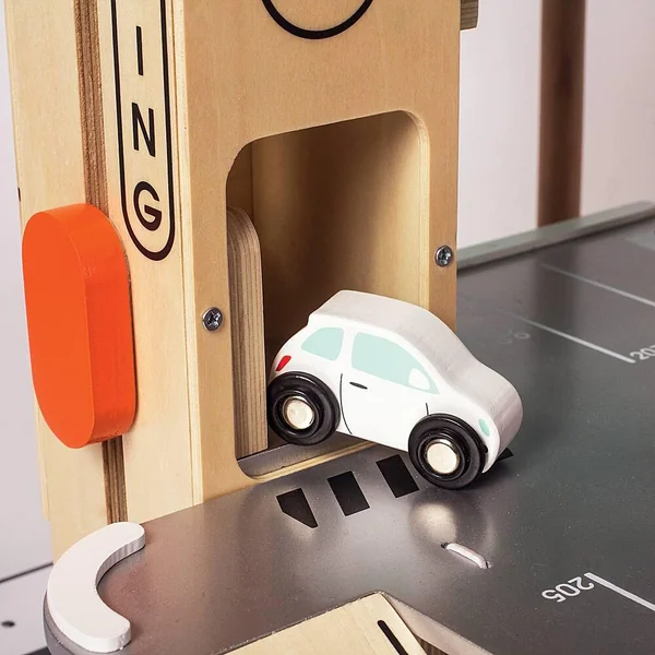 Grand parking sur 4 niveaux, 24 places. L’ascenseur permet de monter jusqu’au 4ème niveau. Equipé d’une station service. Livré avec 3 voitures, 1 hélicoptère de secours et 5 panneaux de signalisation dont une barrière à la sortie du parking. Facile à monter. Notice de montage incluse.