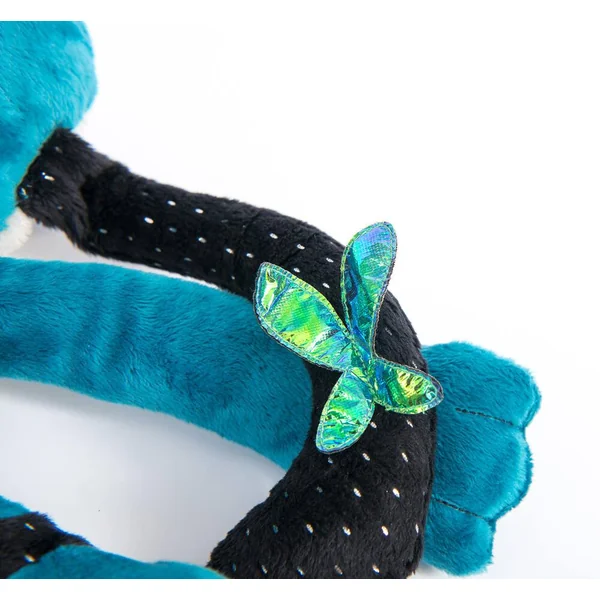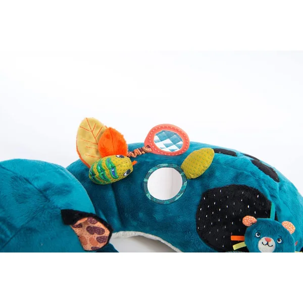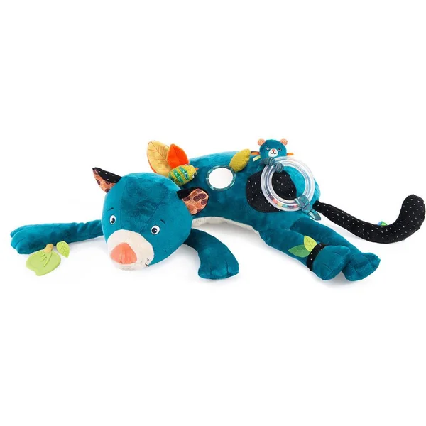 Grande panthère d’activités, accompagnée par son tout-petit, le caméléon et le papillon. Elle comporte un prisme, une spatule dentaire, un miroir, un cordon avec des perles et des petits gris-gris… Son corps est doux et moelleux et peut servir de coussin.