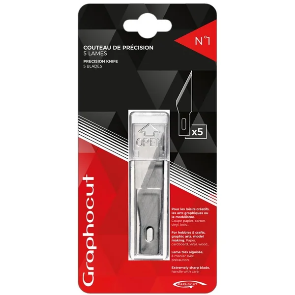 Pratique et astucieux, le couteau n°1 est doté d’un design ergonomique et d’un manche grip anti-glisse assurant un confort d’utilisation et une grande maniabilité. Le capuchon permet de ranger le couteau en toute sécurité 5 lames n°1 incluses.